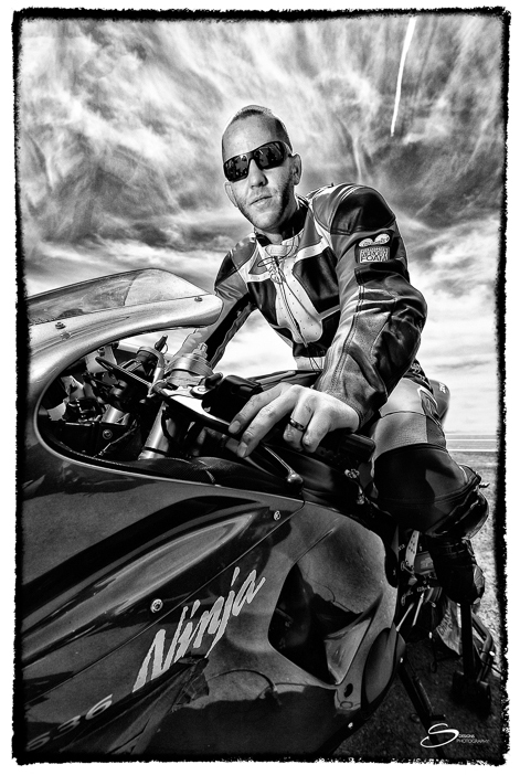 In these motorcycle portraits, the guys just got off the track where they broke speed records passing others around the turn, one knee dragging on the ground and sending sparks flying. They have the courage to get back on their bikes after tipping over and sliding through gravel for a hundred yards. I'm just taking it for granted that you have the courage to approach them and ask to take their picture.
